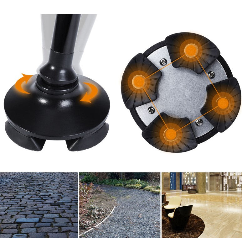 La conception en 360 degrés de ce pied de canne signifie qu'il peut pivoter dans toutes les directions, offrant une stabilité maximale. Cela permet à l'utilisateur de marcher sur des sols inégaux, des trottoirs inégalement pavés, des surfaces glissantes ou des pentes légères en toute confiance. Le pied de stabilité à 360 degrés s'adapte automatiquement à la position de la canne et au poids de l'utilisateur, ce qui réduit le risque de trébucher ou de perdre l'équilibre.